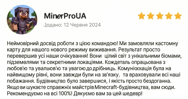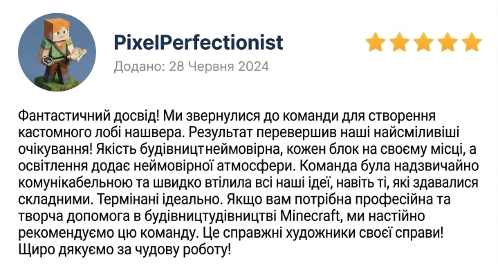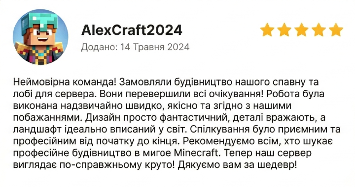 Ми — команда досвідчених будівельників у Minecraft, які перетворюють ідеї на унікальні віртуальні світи. Створюємо все: від затишних будинків до масштабних міст, серверних спавнів і фантастичних ландшафтів.
